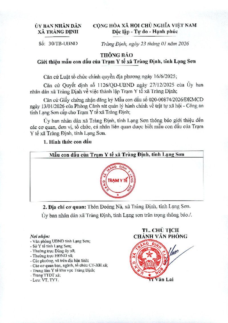 | Tiêu đề văn bản | Thông báo mẫu con dấu Trạm Y tế xã Tràng Định | ||