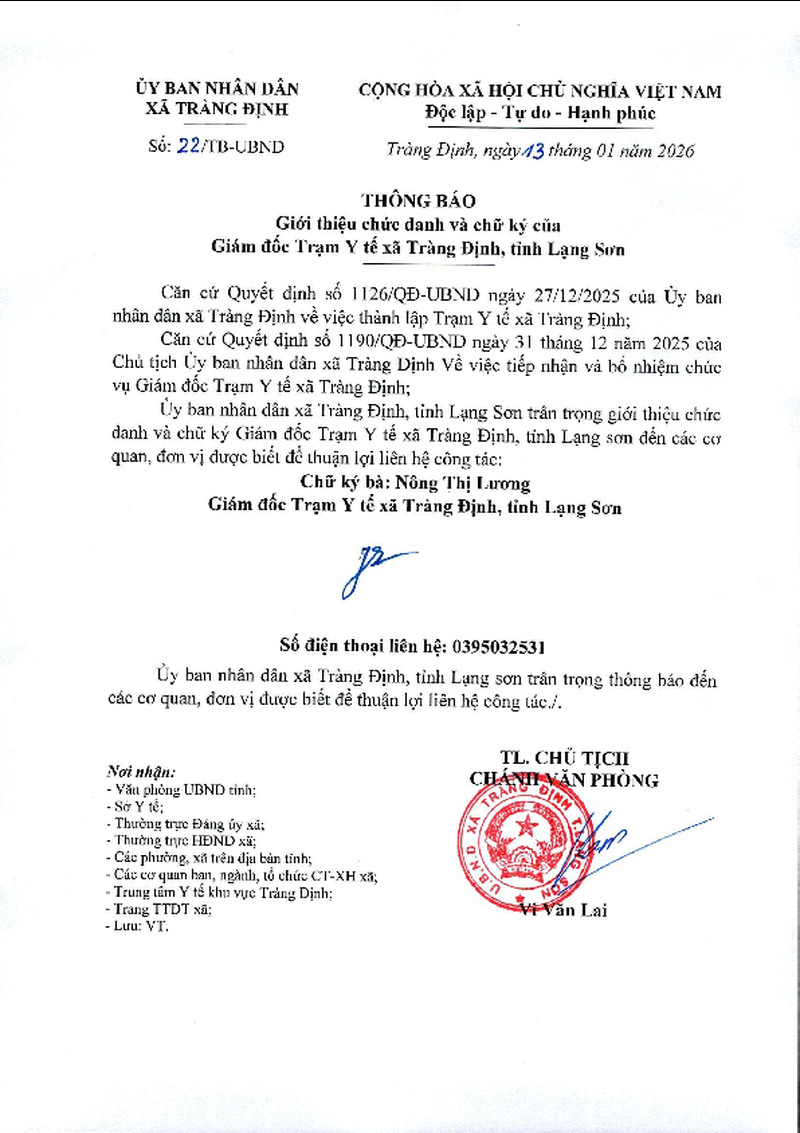 | Tiêu đề văn bản | Thông báo chức danh chữ ký Giám đốc Trạm Y tế xã Tràng Định | ||