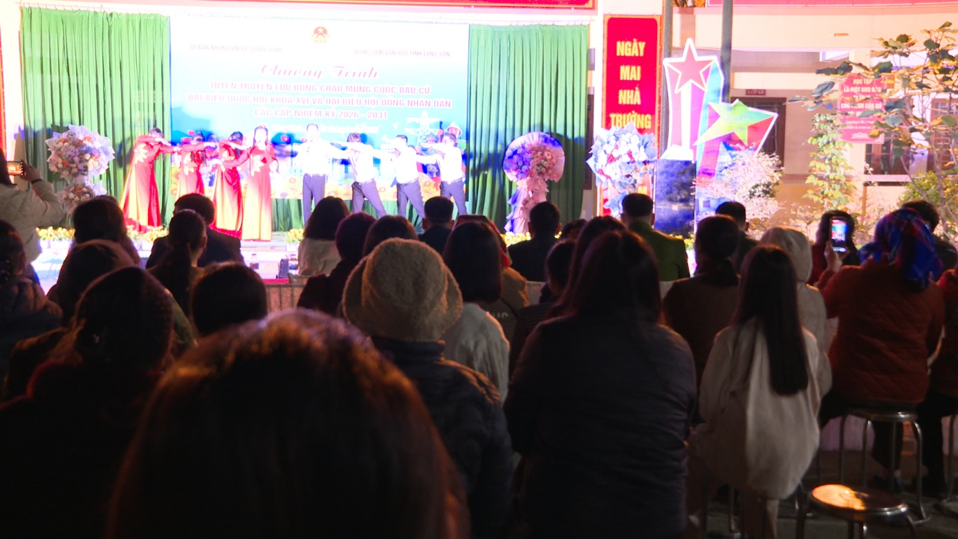 Tối 11/03/2026, Trung tâm Văn hóa tỉnh đã phối hợp với UBND xã Tràng Định tổ chức chương trình tuyên truyền lưu động chào mừng cuộc bầu cử đại biểu Quốc hội khóa XVI và bầu cử đại biểu Hội đồng nhân dân các cấp nhiệm kỳ 2026 – 2031.