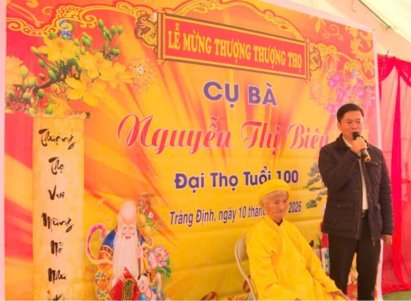 Thực hiện Chương trình số 24/CTr-UBND, ngày 03/3/2026 của UBND tỉnh Lạng Sơn về chương trình Chúc thọ, mừng thọ người cao tuổi thọ 100 tuổi trên địa bàn tỉnh năm 2026.Nhân dịp đầu xuân năm 2026, cấp ủy, chính quyền và các đoàn thể xã Tràng Định đã tổ chức chương trình chúc thọ, mừng thọ cho cụ Nguyễn Thị Biên, tròn 100 tuổi, hiện đang sinh sống trên địa bàn xã.
