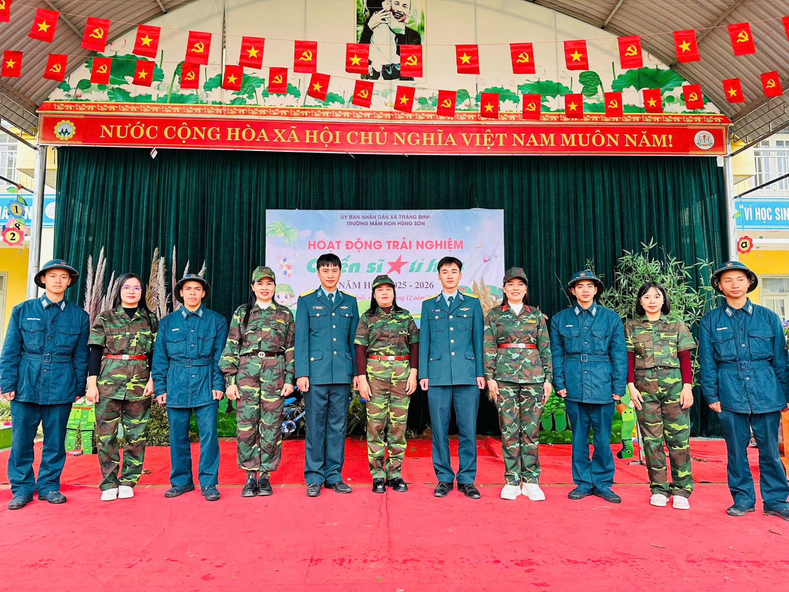 Sáng ngày 12/12/2025, Trường Mầm non Hùng Sơn, xã Tràng Định phối hợp với Trạm Radar 59 và Ban đại diện cha mẹ trẻ em tổ chức hoạt động trải nghiệm “Chiến sĩ tí hon” với chủ đề “Bé yêu chú bộ đội” dành cho trẻ mẫu giáo 3–5 tuổi.